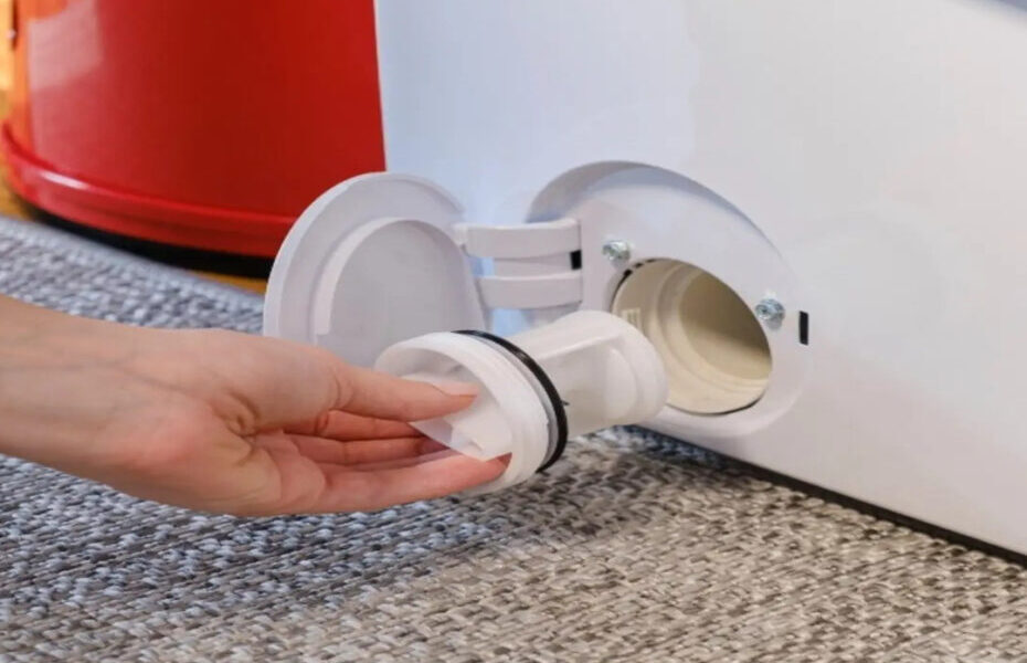Una vez tomadas estas precauciones, el primer paso consiste en vaciar la bandeja del filtro, girando el tapón en sentido antihorario. Durante esta fase, es normal que salga agua; es importante esperar a que el agua se vacíe por completo para evitar mojarse innecesariamente y prepararse para la siguiente fase de la limpieza.